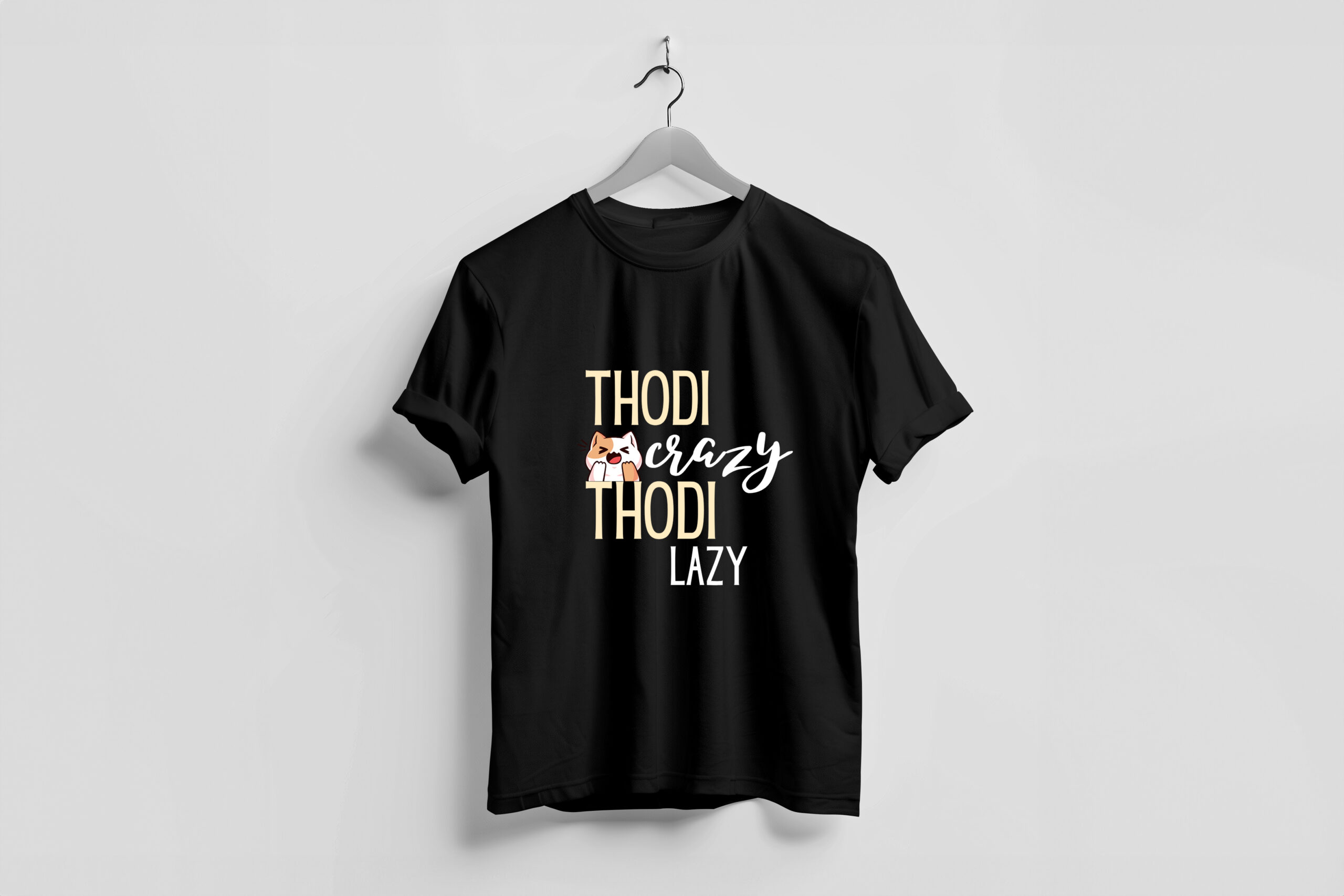 Show off your perfect balance of energy and relaxation with the Thodi Crazy Thodi Lazy T-Shirt. This comfortable black tee captures a relatable, playful mood with its popular phrase, meaning “A little bit crazy, a little bit lazy.”
