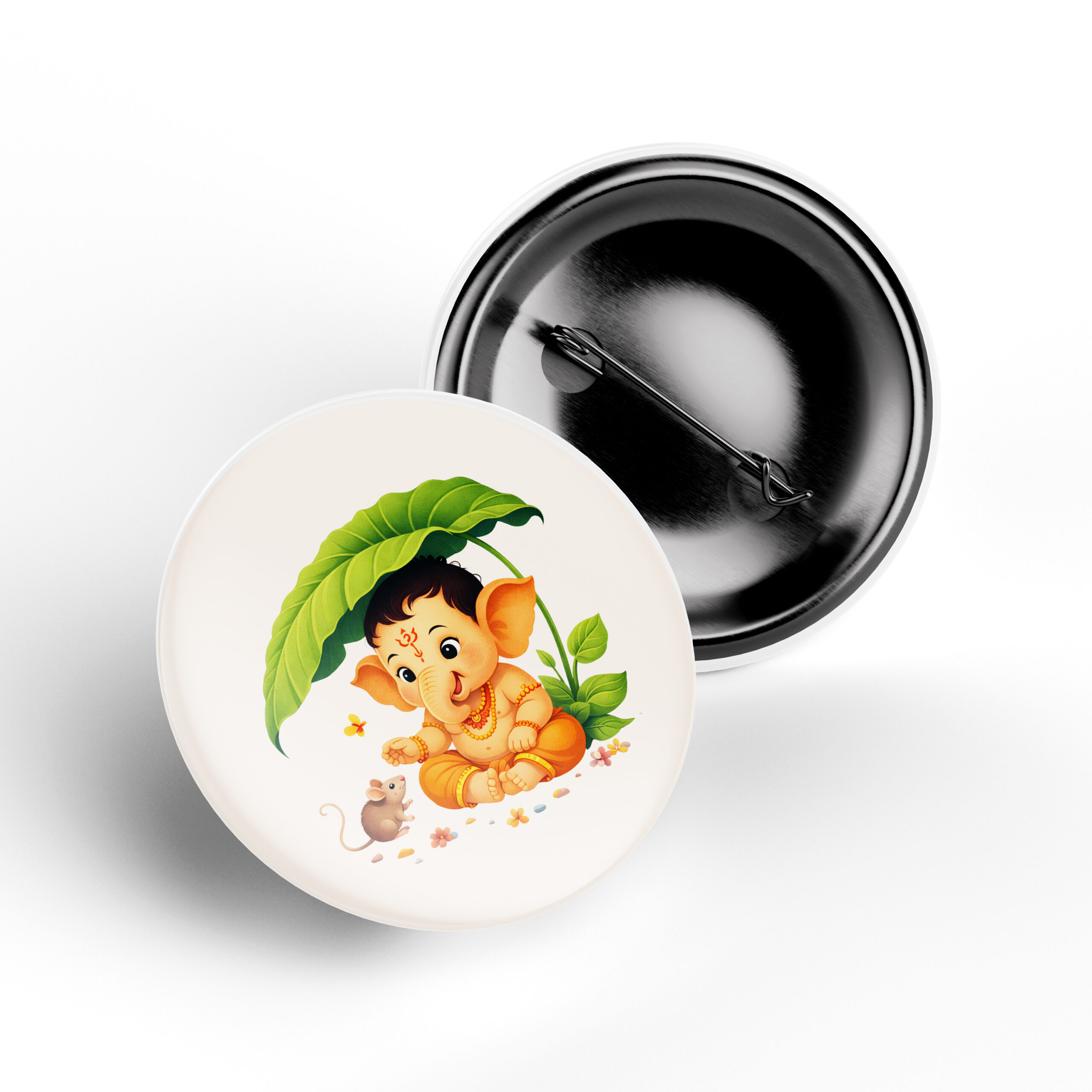 Baby Ganesha Blessings Badge featuring premium devotional design. Glossy pin ideal for gifting and festive occasion