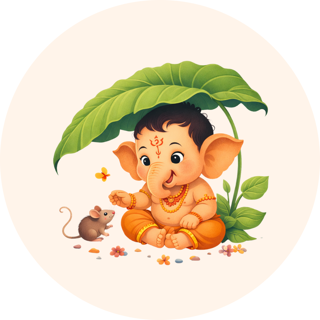 The Divine Baby Ganesha Blessings Badge is a beautifully illustrated devotional accessory that captures innocence, purity, and divine protection. Featuring an adorable baby Ganesha seated peacefully under a large green leaf, accompanied by his loyal companion mouse, this badge radiates calm and spiritual warmth.