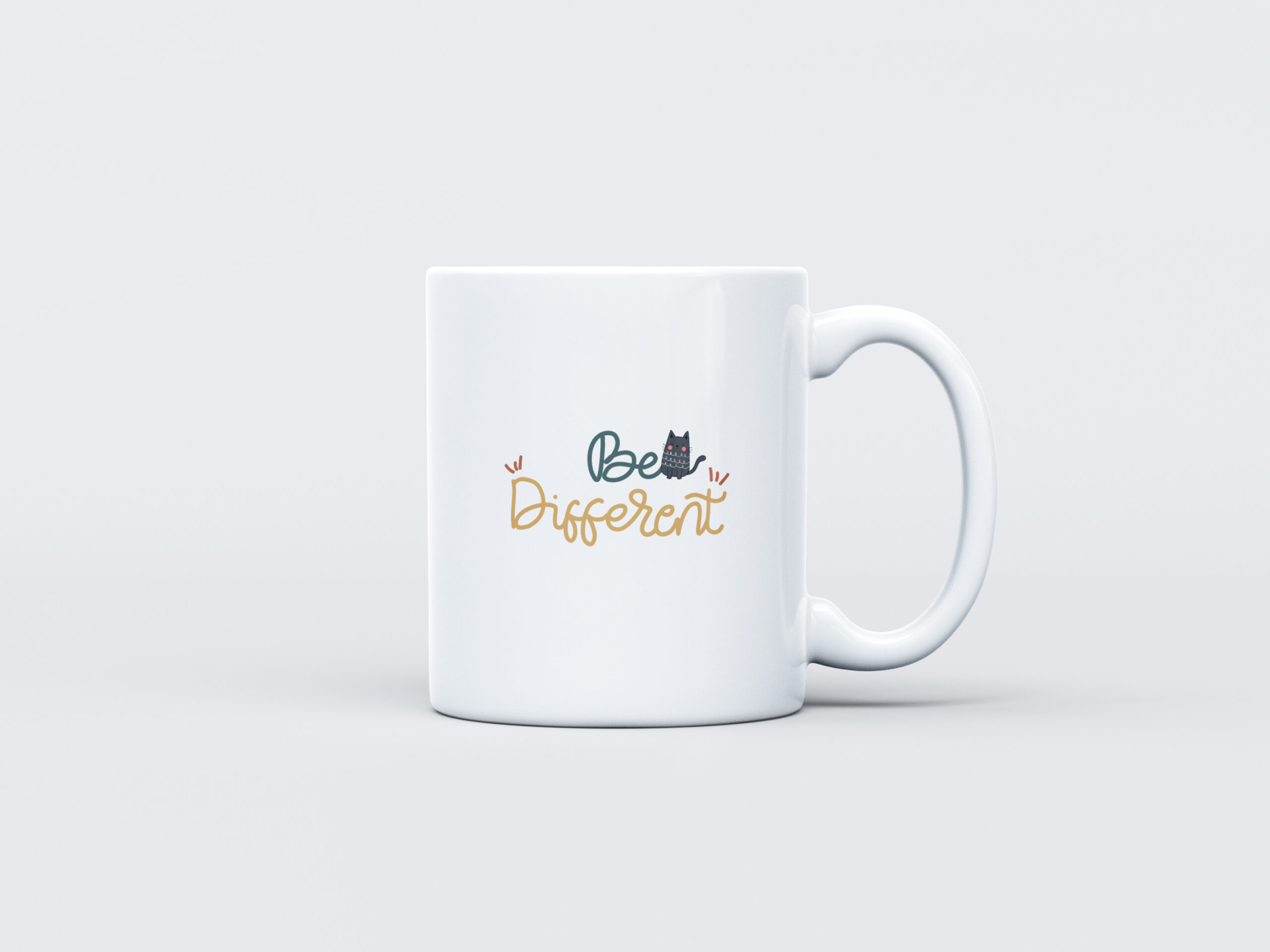 Celebrate your individuality! Charming white ceramic mug with a cute cat graphic and the motivational quote “Be Different.”