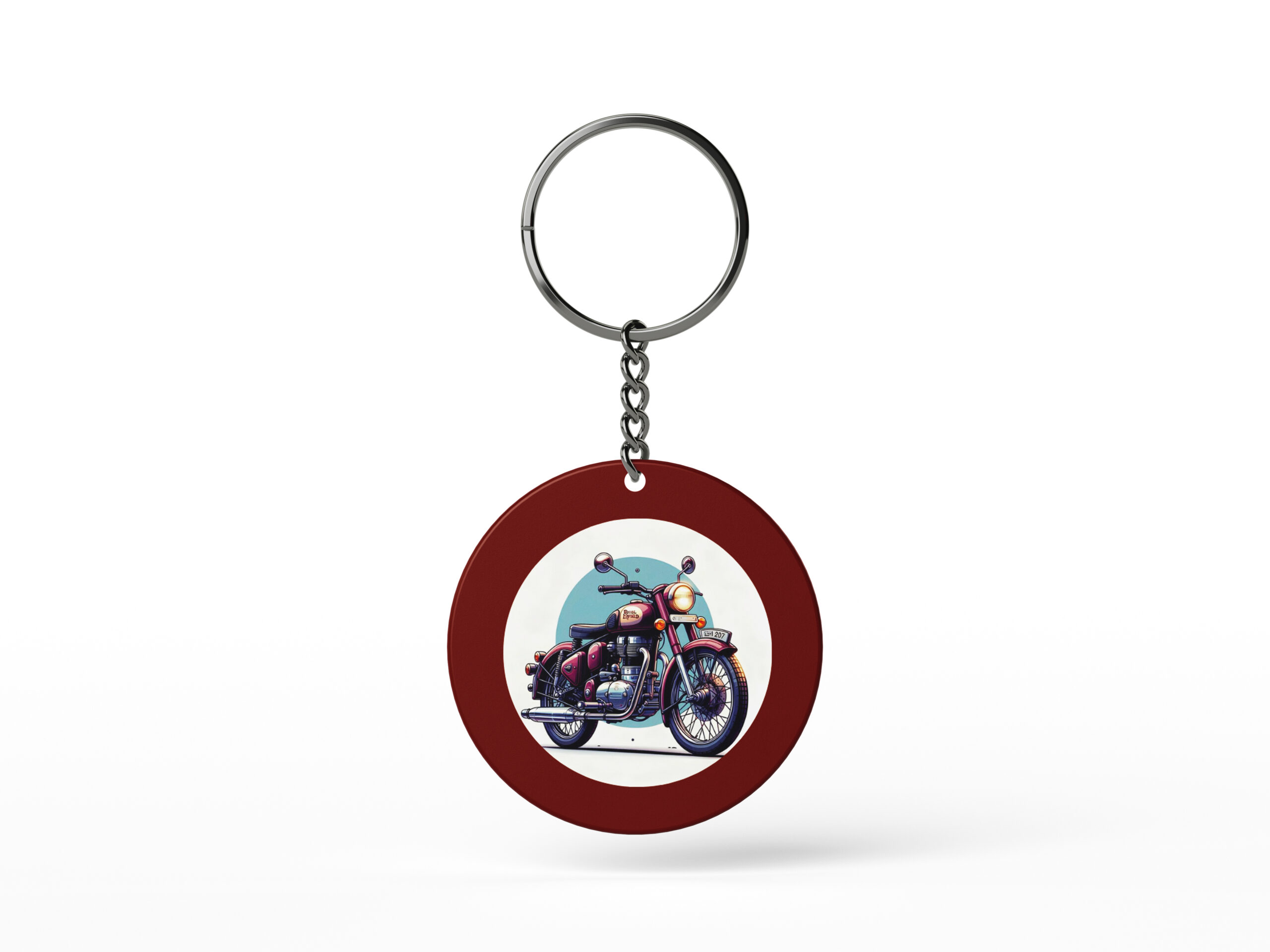 A stylish circular keychain featuring a bold maroon/dark red outer ring and a central graphic of a classic retro cruiser motorcycle. The detailed artwork showcases the motorcycle’s vintage design in shades of red, chrome, and black, set against a light blue, artistic background. This keychain is perfect for motorcycle enthusiasts, riders, or anyone who appreciates the aesthetics of vintage bikes and adds a rugged yet sophisticated touch to your keys.