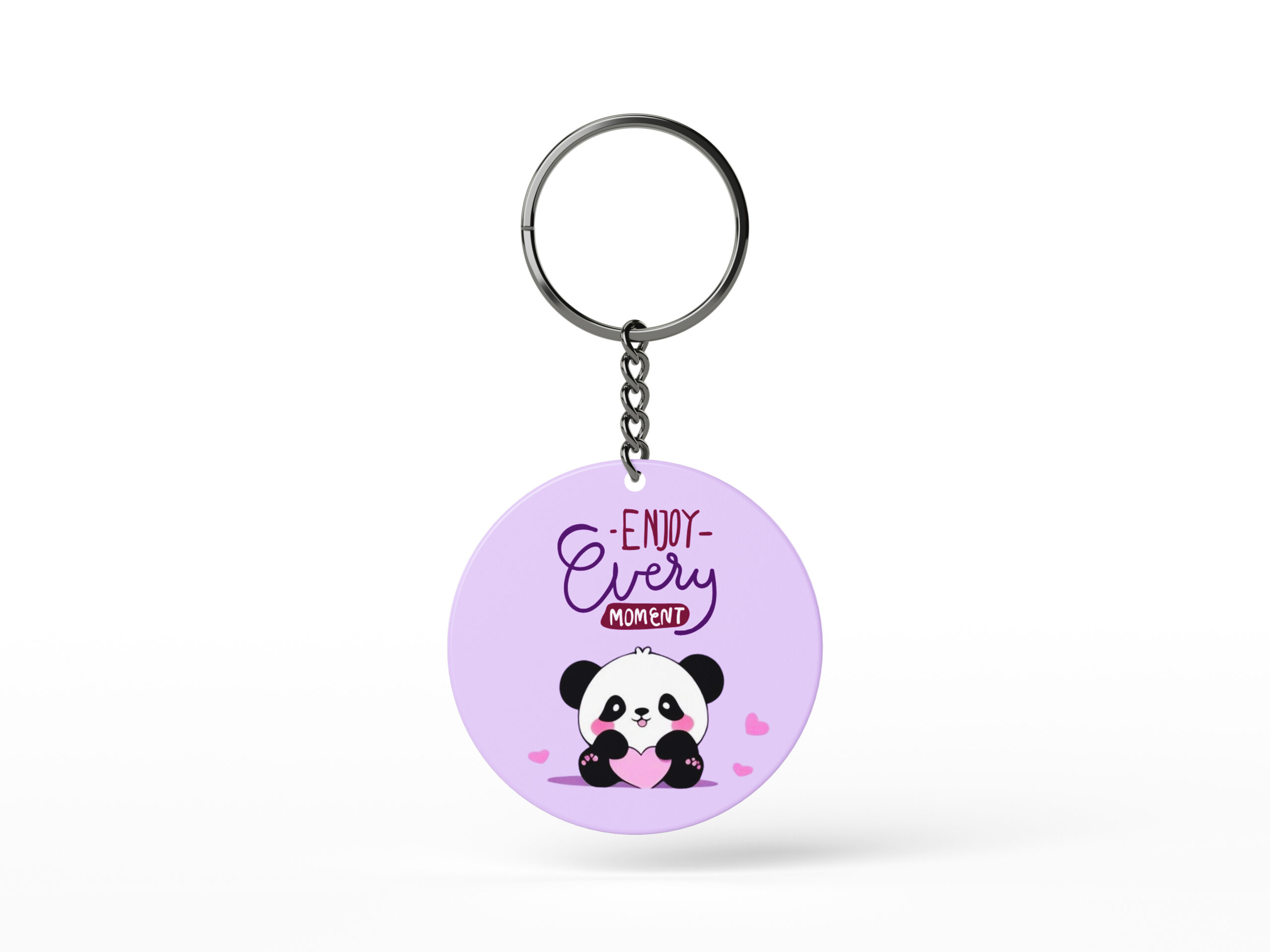 Carry a pocket-sized reminder to cherish every day! This charming circular keychain features an adorable baby panda holding a heart, with the uplifting motto “Enjoy Every Moment” in elegant script. The soft lilac/lavender background and cute heart accents make it a sweet, gentle accessory. It’s perfect for securing your keys, decorating a bag, or gifting to a friend who loves cute aesthetics and positive messages.