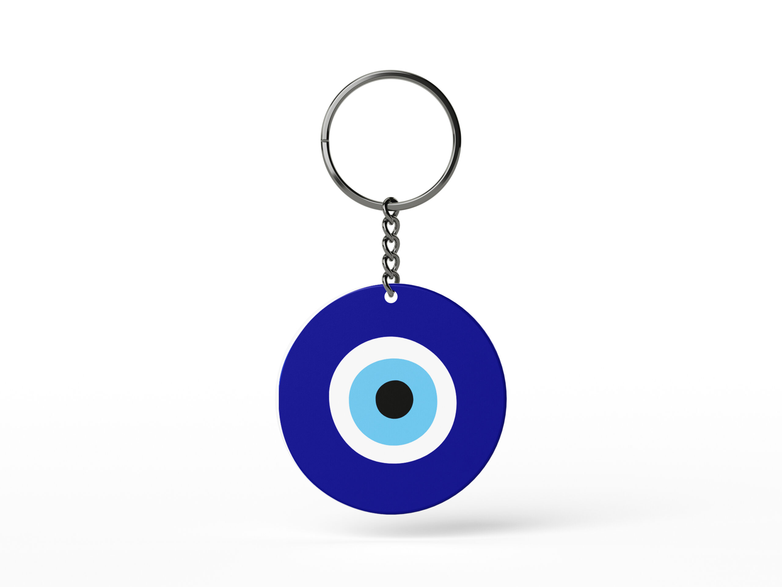 Circular keychain featuring the traditional deep blue and white Evil Eye (Nazar Boncuk) design for protection and good luck.