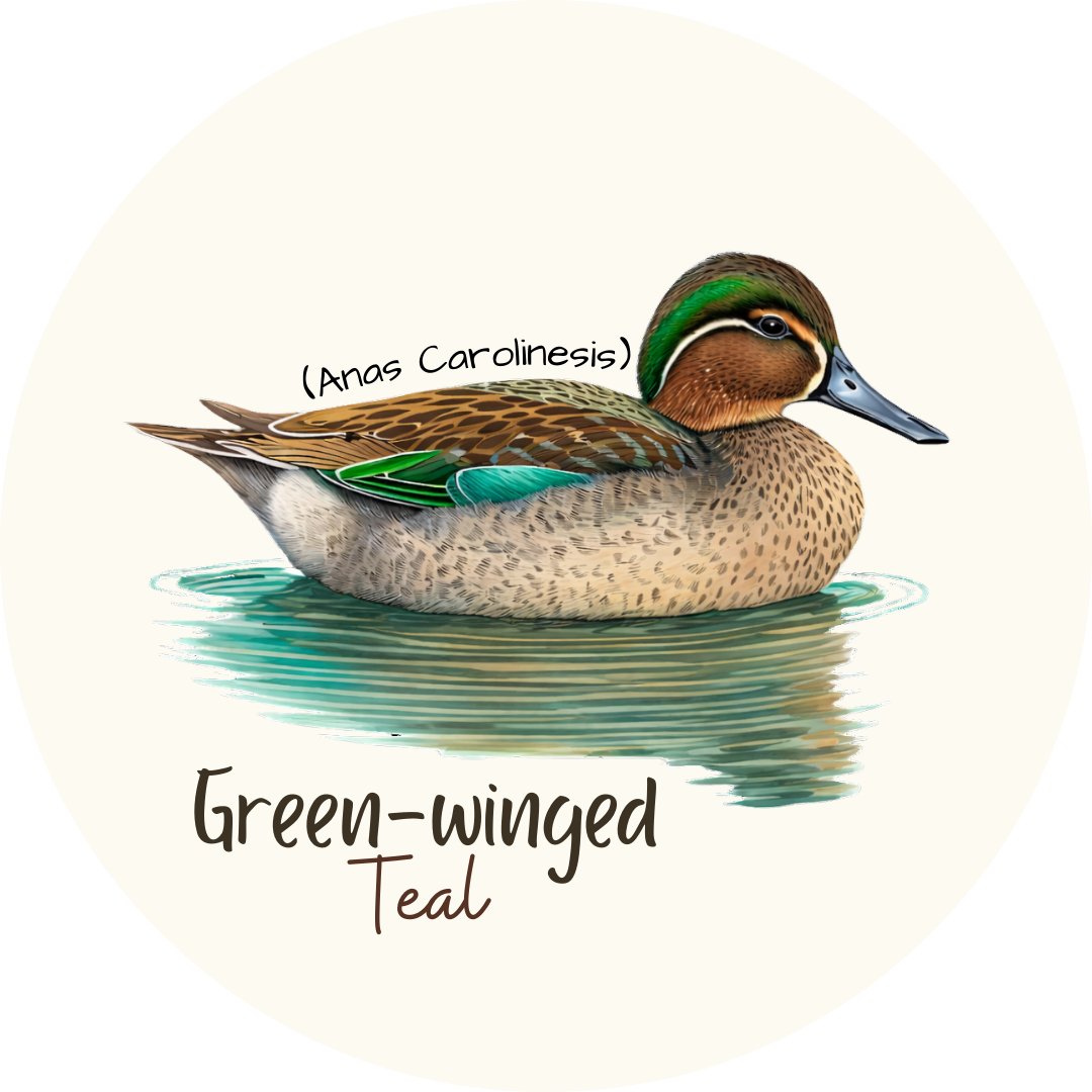 The Green-Winged Teal is one of the smallest dabbling ducks in North America and parts of Eurasia. Known for its striking emerald-green eye patch and detailed feather pattern, it is admired by birdwatchers worldwide.