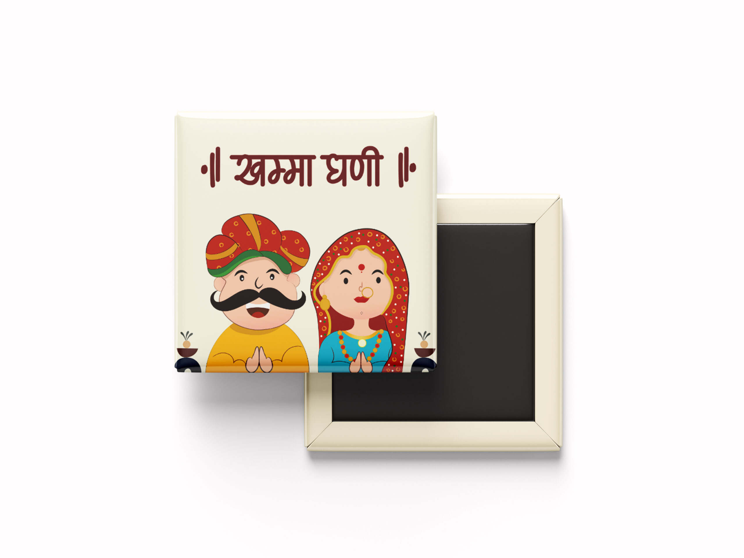 This unique fridge magnet is a beautiful tribute to Rajasthani tradition and hospitality. It features a charming, cartoon-style illustration of a welcoming Rajasthani Couple dressed in traditional attire, with the gentleman sporting a vibrant turban and a magnificent mustache. Above them is the classic Marwari greeting, “|| खम्मा घणी ||” (Khamma Ghani), which translates to “Many Greetings” or “May you be excused/forgiven,” used as a respectful welcome.