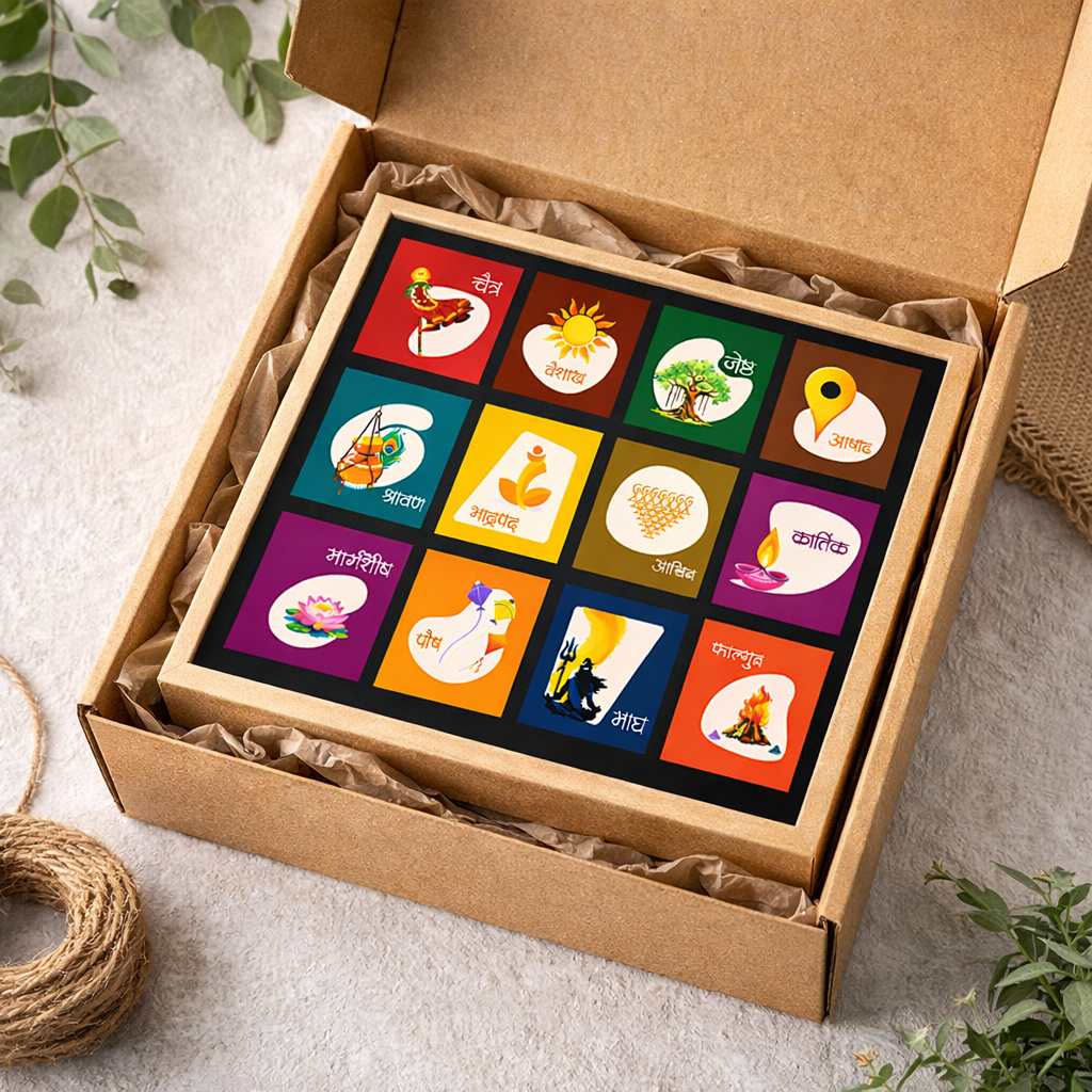 This Marathi Calendar Frame Wall Art is more than a decorative item — it is a cultural statement. Each month is represented with a unique icon inspired by seasonal changes, festivals, spirituality, and everyday Maharashtrian life. From Chaitra’s festive beginnings to Phalgun’s celebratory warmth, every tile reflects emotion, heritage, and identity.