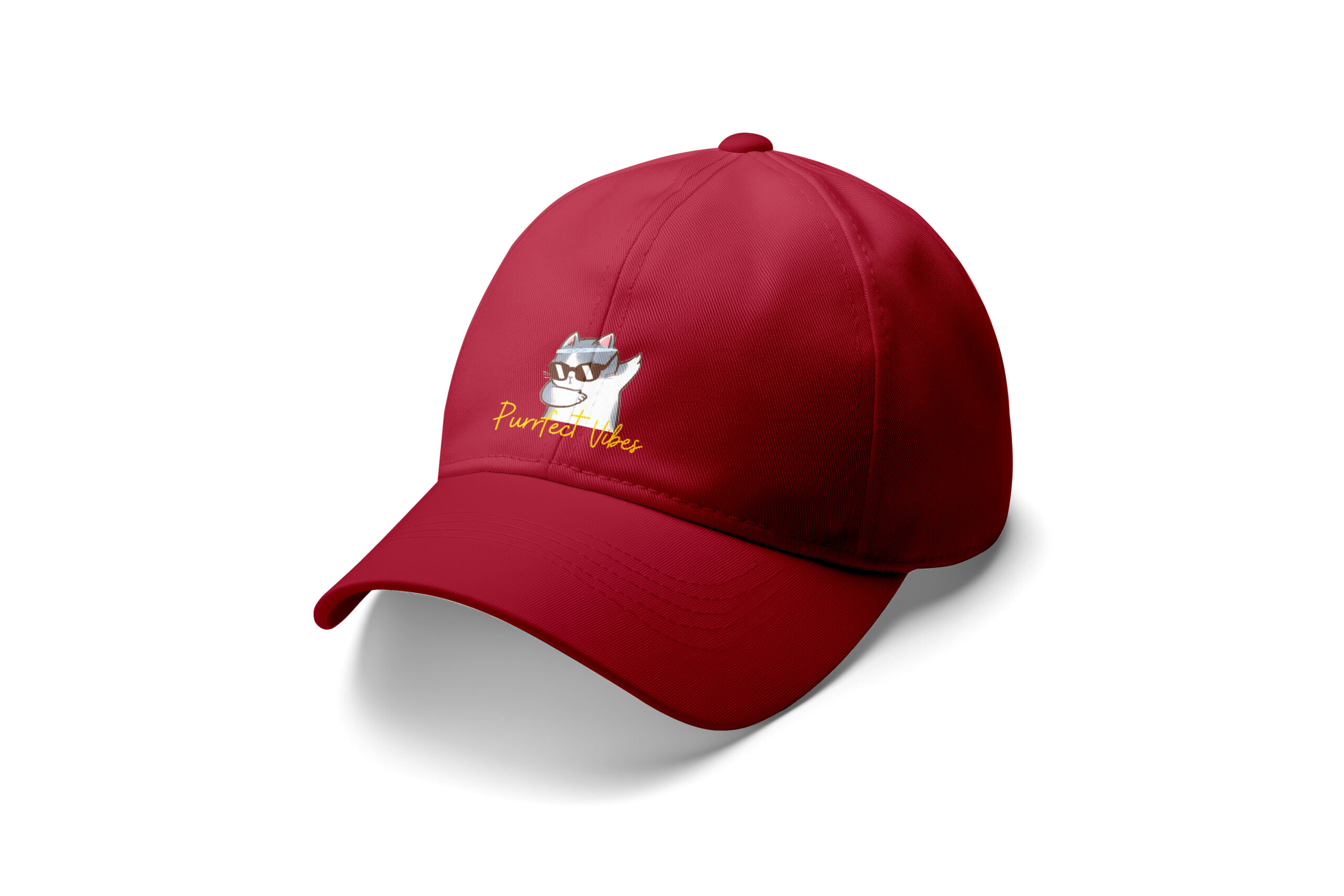 Show off your relaxed and playful side with the “Purrfect Vibes” Baseball Cap. This cap comes in a deep, versatile dark color (like navy or charcoal) and features a classic curved brim. The highlight is the fun, digitally printed graphic of a cool cat wearing sunglasses, along with the yellow script text: “Purrfect Vibes.” It’s the ideal accessory for cat lovers, sunny days, or anyone looking to add a humorous, laid-back element to their outfit.