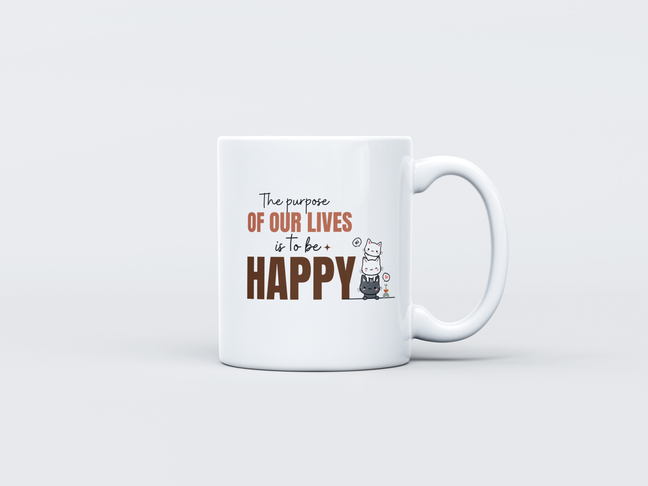 A profound and uplifting reminder with a cute twist! This bright white ceramic mug features a classic philosophical quote: “The purpose OF OUR LIVES is to be HAPPY,” with the central message highlighted in bold brown font. The design is complemented by an adorable stack of three little cartoon cats, adding a charming, playful touch. Holding 325 ml (11 oz), this durable mug is microwave and dishwasher safe, making it a perfect, cheerful companion for your coffee, tea, or hot chocolate. It’s an ideal gift for cat lovers, minimalists, and anyone who cherishes a daily dose of positive philosophy.