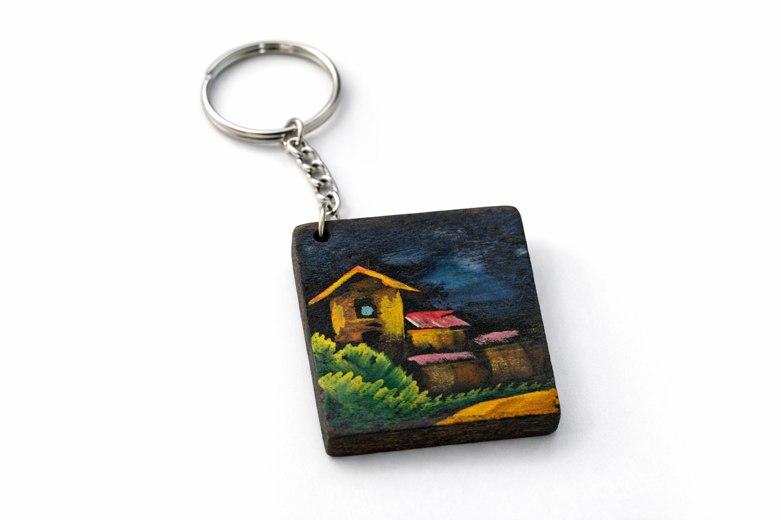 The natural wooden texture enhances the beauty of the village house night wooden keychain, giving it a premium feel.