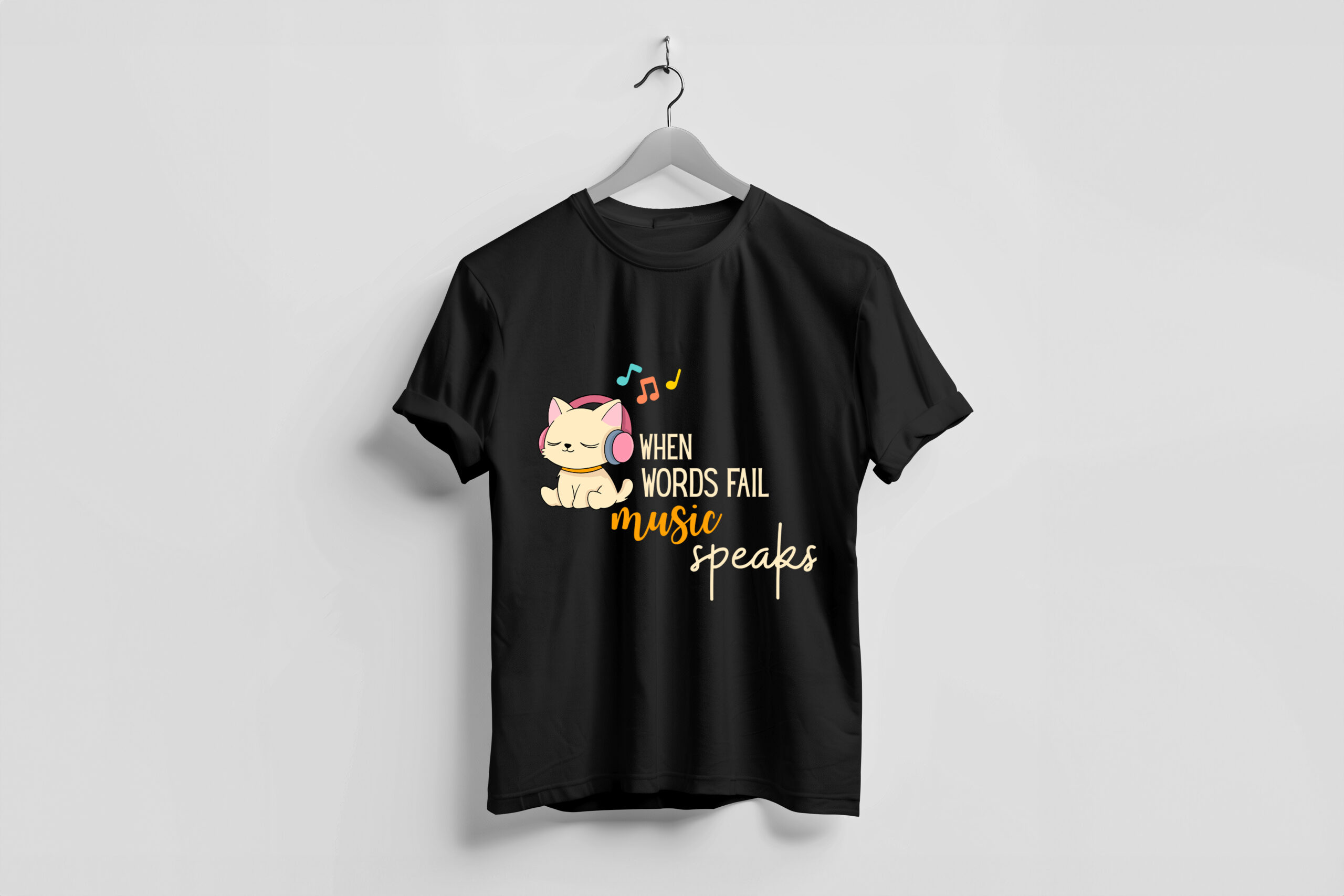 This charming black T-shirt is a must-have for music lovers and cat enthusiasts alike. The design features an adorable, cartoon-style cat wearing pink headphones with colorful music notes floating above. Next to the cat is the heartfelt quote: “WHEN WORDS FAIL music speaks” in a mix of white, yellow, and script fonts. It’s a sweet and stylish way to show off your passion for melody and feline friends.