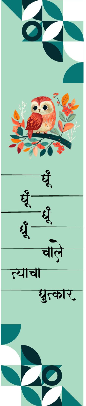 This bookmark features a beautifully illustrated, vibrant red owl perched amidst delicate autumn leaves. The owl, a universal symbol of wisdom and late-night curiosity, is the perfect mascot for the avid reader. What sets this piece apart is the elegant Marathi calligraphy flowing down the center. The playful repetition of “घूँ” (Ghoo)—the hoot of the owl—followed by “चाले त्याचा धुत्कार” (Chale Tyacha Dhutkar) evokes a sense of mystical movement and personality. It’s a nod to traditional Marathi phonetics blended with modern, geometric aesthetics.